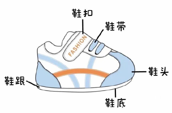 孩子们对鞋子有了一定的认识后,我们又对鞋子的构造进行了深入研究,通过观察图片及自己所穿的鞋子,孩子知道了鞋子由鞋头、鞋面、鞋舌、鞋带、鞋帮、鞋底等多个部分组成。