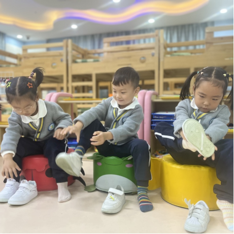 为了提高孩子的生活自理能力,帮助孩子能够自己独立完成穿鞋,我们开展了穿鞋大比拼活动。