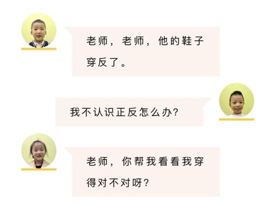 在与幼儿的交谈中,我发现幼儿对于穿反鞋子的现象有一定的了解。有的能通过比较鞋头来辨别穿鞋子的正反,有的还能用辨别魔术贴、鞋扣等方法正确穿鞋子。我们鼓励孩子学会自我检查、相互检查,边检查边记住:“鞋头碰碰头”就穿对了;“鞋头背对背”就穿反了。引导幼儿对比发现正反鞋的不同,并用形象的儿歌加深幼儿对正反鞋的辦认、理解。