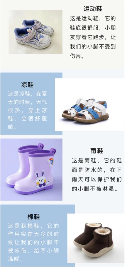 孩子们在调查、交流、讨论的过程中,认识了各种各样的鞋子,知道运动鞋、拖鞋、棉鞋、皮鞋、高跟鞋等,通过活动也让幼儿进一步感知了不同的季节有不同的鞋子。