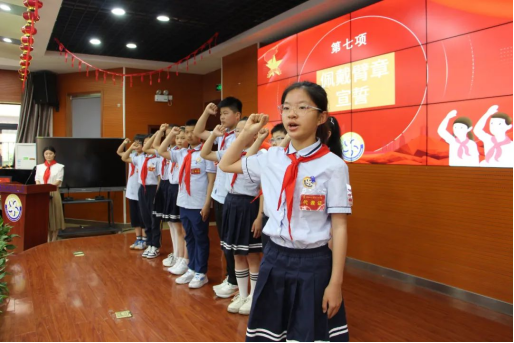 与会领导为新一届大队委员佩戴标志,大队长俞馨然带领新一届大队委员宣誓。