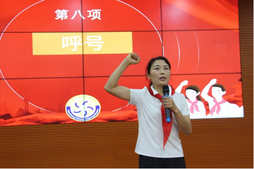 肥光小学少工委主任王春景带领队员们呼号。