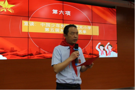 肥光小学副校长李大应宣布《中国少年先锋队肥光小学第五届大队委员名单》。