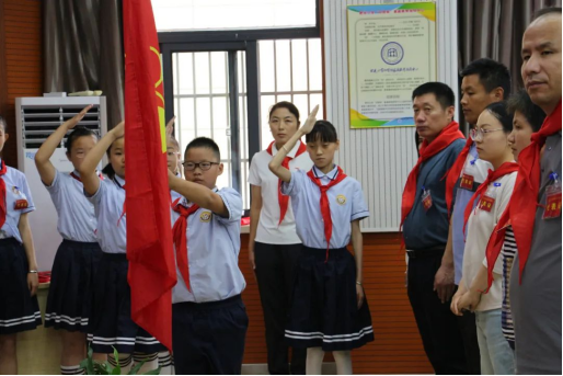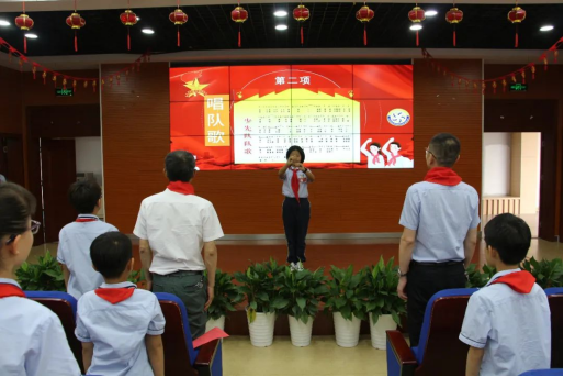 大队委员王骄阳带领全体队员齐唱队歌《我们是共产主义接班人》。