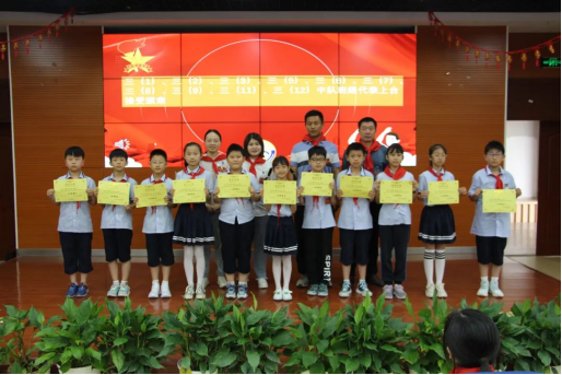 肥光小学党总支副书记周宗友宣读《关于为肥光小学三(3)中队、队员王奕诚等进行“红领巾奖章”颁章的决定》。
