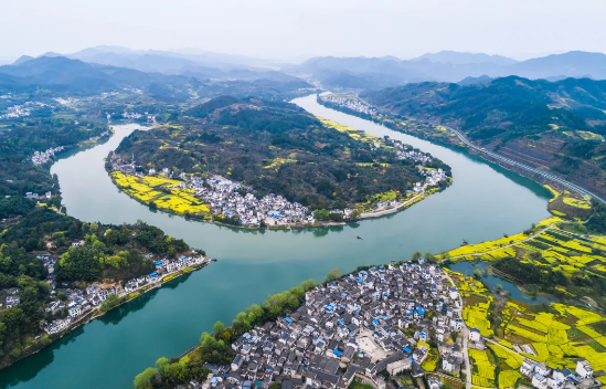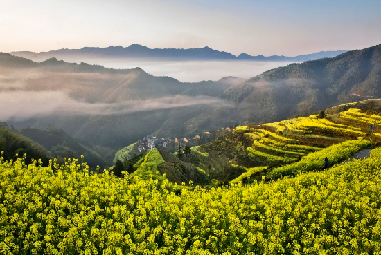 皖南歙县三阳镇上坦自然村,这里的高山梯田如链似带,梯田里的油菜花一片金黄,层层叠叠,错落有致。从空中俯瞰,层层梯田尽收眼底,惊艳无比的油菜花海和古朴的高山村落相互交融,美不胜收。