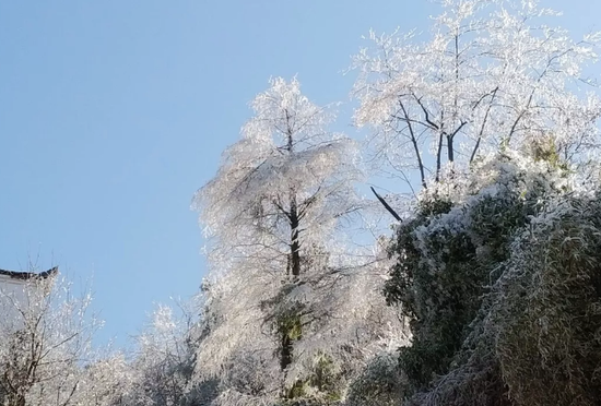 九华初冬时节,气温骤降,云雾漂遇树木便迅速凝聚冻结,形成雾凇。满山遍野的玉树琼花,疑是大雪覆盖,玲珑剔透,千姿百态,美不胜收。