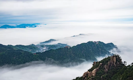 新雨初霁,九华山湮没在滚滚白浪之中。放眼远望,被云海浸润的佛国,显得格外神秘。或浓或淡的雾气,从眼前铺开,洋洋洒洒,沾满山间,一方茫茫世界,带着无限诗情画意。