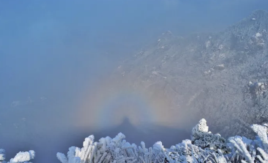 霁雪初晴,连绵峰峦银装素裹,茫茫云海在阳光下翻滚美妙如画,佛光从山麓闪现而出,在阳光下熠熠生辉,无比耀眼,恍如置身童话世界。