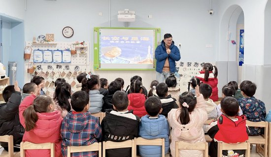 大四班的教室里暖意融融,陈韵涵爸爸带来了绘本《你是哪颗星星》,将孙家栋爷爷的航天梦娓娓道来。家长一页页翻开色彩斑斓的绘本,用温柔的声音,把孙家栋爷爷与卫星、火箭相伴的一生,化作一个个充满童趣的画面。孩子们跟着故事的节奏,时而屏息聆听,时而发出惊叹,仿佛自己也跟着卫星飞上了蓝天。这场绘本故事分享,让孩子们认识了一位把“星星”送上天的科学家爷爷,也让航天梦的小种子,在孩子们的心中悄悄发芽。