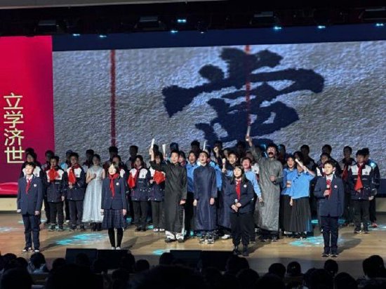 如果说前半场响亮的乐曲是充满青春活力的当下,那么后半场精彩纷呈的歌舞剧则是沉淀的历史。八(6)班少年们带来的《错位时空》舞台剧,将陈独秀、李大钊等先驱“召唤”至现场,用歌声与演绎完成一场跨越百年的青春对话;八(12)班则以诗朗诵、舞蹈与钢琴等多种形式,磅礴再现《长征》之路,气韵恢弘;八(8)班原创歌舞剧《向阳的选择》尤其令人动容,它从一道关于“铭记南京大屠杀死难者意义”的考场选择题切入,将观众代入1937年的凛冬。当历史场景落幕,少年在考场上肃然起身:“这道题,没有标准答案,唯有铭记本身。”这一刻,艺术超越了审美,成为淬炼历史观与责任感的熔炉!