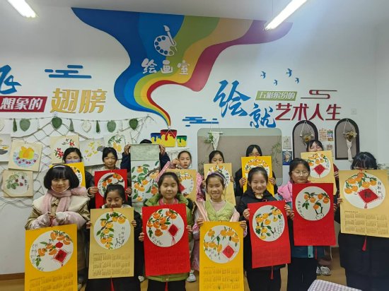 绘画室里,则是另一番雅致景象。同学们在崭新的2026年挂历上,提笔绘制国画柿子。调藤黄,染朱砂,笔尖轻点,一颗颗圆润饱满的柿子活灵活现地出现在枝头。孩子们兴致盎然,有的画出累累硕果,寓意“硕果累累”;有的添上如意纹饰,祝福“事事如意”。一幅幅红润的柿果图,让普通的挂历变成了独一无二的艺术品,绘出了对新年生活甜蜜、硕果累累的期盼。
