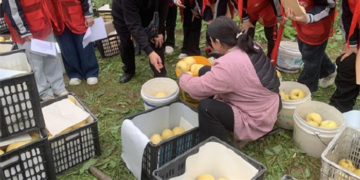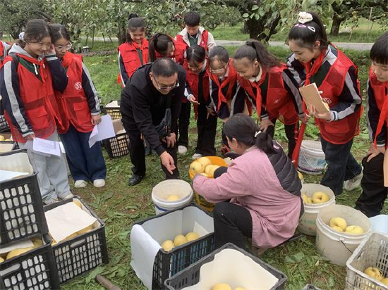 (在梨树王景区,孩子上们帮助农民采摘梨子)