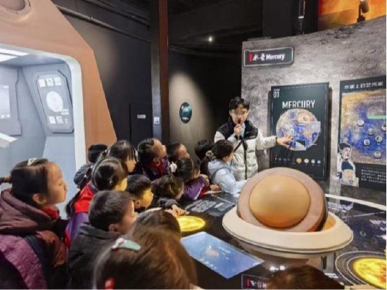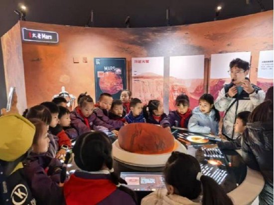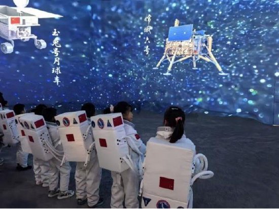 离开太阳系时,身后太阳的光芒逐渐淡去,行星化作遥远的光点散落在黑暗中。穿过太阳系边界,周围愈发寂静,唯有星光在深空中闪烁。接着,他们朝着地球方向靠近,月球的轮廓在前方慢慢清晰——走进月球展区,队员们倾听了人类主要月球探测任务概览,了解了中国取得的突破性成果。当讲解员问道:“你们觉得20年后可以建成深空探测中转枢纽吗?”小队员们异口同声地回答:“可以!”