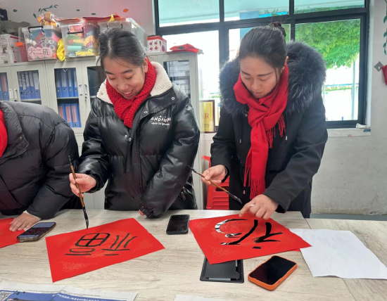 活动现场,老师们齐聚一堂,桌上红纸铺展、笔墨备齐。大家凝神聚气,提笔蘸墨,在红纸上挥毫书写“福”字,有的笔锋刚劲有力,有的字体圆润饱满,一幅幅饱含心意的“福”字跃然纸上。书写之余,老师们还相互交流笔法心得,分享新年愿景,活动室里墨香四溢,笑语盈盈。