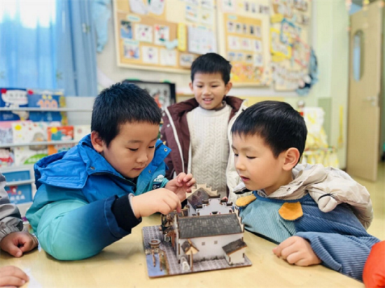 在了解安徽美食的同时,孩子们还兴奋地分享自己去过的安徽景点。他们用稚嫩的画笔描绘出外出时看到的徽派建筑,在集体活动和游戏中,进一步了解了粉墙黛瓦和“马头墙”的独特模样。孩子们还将从景点带回来的纪念品带到幼儿园,与好朋友一起欣赏,仔细观察它们的与众不同之处。