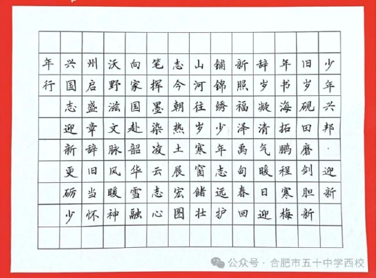 翰墨飘香添雅韵,文化传承启新程。本次书法比赛地成功举办,为岁末年初的校园增添了浓郁的文化气息与节日氛围,更点燃了同学们传承传统书法艺术的热情与责任感。未来,合肥市五十中学西校教育集团将持续搭建多元育人平台,以丰富多彩的文化艺术活动为载体,助力学生全面发展,让中华优秀传统文化在校园沃土中生根发芽,绽放出更加璀璨的时代光彩。