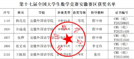 安徽外国语学院斩获全国大学生数学竞赛安徽赛区二等奖