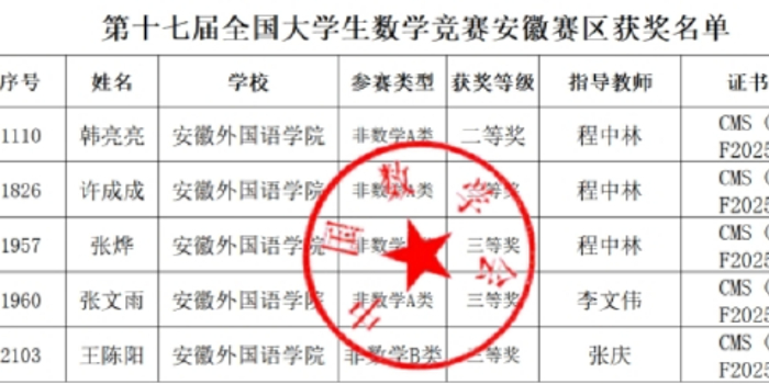 关注近日,第17届全国大学生数学竞赛成绩正式揭晓,安徽外国语学院选派28名学子参赛,斩获非数学A类二等奖1项、三等奖3项和非数学B类三等奖1项。