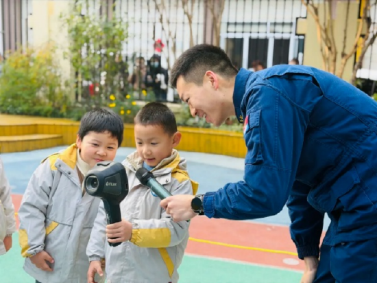 活动中,消防员结合幼儿的年龄特点,用通俗易懂的语言和生动形象的演示,逐一介绍了救生照明线、灭火防护服全套、热成像仪、破拆电锯等专业消防设备。