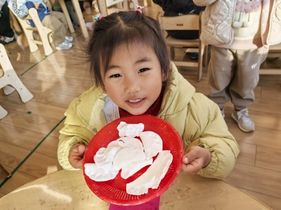 中班的孩子们化身“小小面食家”,在老师讲解了冬至吃饺子的习俗并欣赏了各式各样的饺子图片后,孩子们迫不及待地用创意泥,揉、捏、压、搓等技能制作出了一个个形态各异、充满童趣的“饺子”,稚嫩的小手创造出满满的成就感,也让孩子们在创造中深化了对习俗的理解。