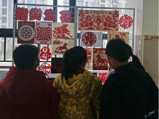活动后期,精心布置的作品展示区成为了校园里一道亮丽的风景线。数百幅学生作品整齐陈列,形态各异、创意十足。有的窗花以传统纹样为基础,元宝、牡丹、祥云交织,旁附 “祝北校福运绵长、再创辉煌”的小字;有的融入校园元素,将教学楼、操场、银杏道巧妙剪裁其中,红色花纹间藏着 “我爱北校,愿校园永远美丽”的心意;还有的大胆创新,采用立体剪裁手法做出绽放的梅花,花瓣上写着 “祝北校学子前程似锦”。红色的窗花在阳光映照下格外鲜艳,每一幅都承载着专属的祝福,吸引着学生们驻足观赏。