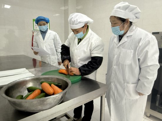 在《中华人民共和国食品安全法》专题学习中,食品安全员胡迎年带领全体食堂工作人员逐条解读核心内容,重点明晰液态食品道路散装运输要求及相关禁止性规定,并强调:“食品安全既是工作准则,更是法律责任”,要求全体人员知法、懂法、守法,切实履行岗位职责,确保餐食安全可溯、健康可控。在食堂燃气安全使用培训中,胡老师结合近年来典型燃气事故案例,详细讲解了燃气设备的正确操作流程、日常检查要点、泄漏应急处置措施等内容,切实提升应对突发情况的能力,确保食堂运行安全平稳、万无一失。在食材专项清洗切配实操考核中,聚焦日常胡萝卜、黄瓜高频使用食材处理流程,食堂人员分组实操,严格按照规范完成清洗、去皮、切丝、切丁等环节,确保食材清洁卫生、大小均匀,契合幼儿食用需求,进一步提升食材处理的标准化与精细化水平。
