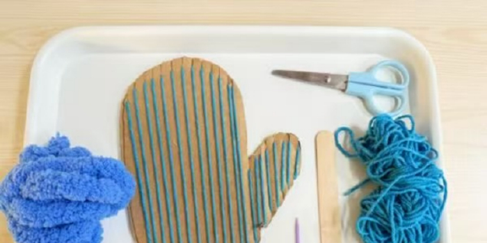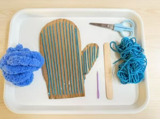 本次活动需要用到的材料有:粗毛线、手套纸板、毛线针、冰棒棍、细毛线、剪刀