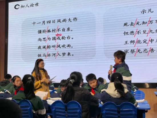 本次研讨课活动内容丰富、安排紧凑,聚焦经典诗词教学,三位教师各展所长,带来了三节精彩的示范课。临湖学校胡文荣老师执教《十一月四日风雨大作》,以细腻的文本解读带领学生感受诗人的爱国情怀;经开实验学校张莉老师带来《秋词》与《潼关》联读课,通过对比赏析引导学生体悟诗词中的豪情与壮志;北校习友校区赵捷老师执教《十一月四日风雨大作》,以新颖的教学设计让学生沉浸式感受诗歌的意境与情感。