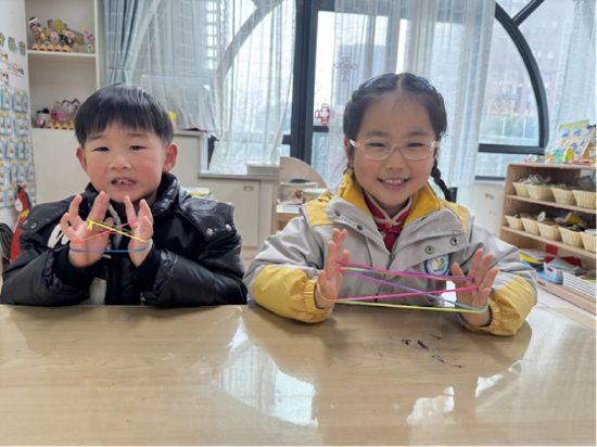 花绳虽普通,但在孩子们的手中却仿佛被赋予了魔法,能够变化万千、妙趣横生。在翻花绳的过程中,孩子们收获了珍贵的友谊和满满的惊喜。一根小小的花绳,不仅锻炼了幼儿手指的灵活性,更增强了同伴间的协作能力,让传统民间游戏在新时代焕发出新的活力。