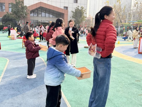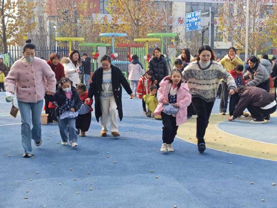 家长腰绑装着仿真鸡蛋的盒子欢快跳动,孩子们手持小筐精准接住掉落的“鸡蛋”,满筐的收获就是最大的喜悦。