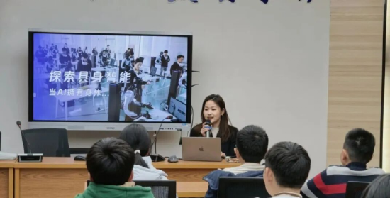讲座围绕“具身智能的定义”“应用领域”“工作原理”以及“伦理与未来”四大板块展开。企业专家首先以“如果人工智能不仅会思考,还拥有身体,它会如何改变我们的生活?”这一问题引入主题,引发了在场同学的浓厚兴趣与热烈讨论。