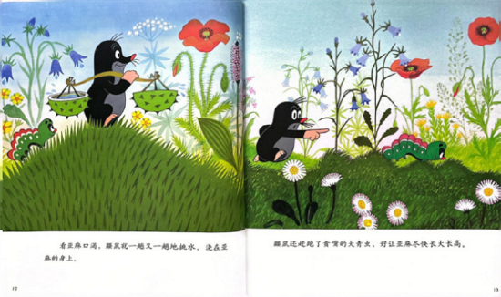 就在这时,旁边一朵善良的花弯下了腰,原来是亚麻。亚麻轻声对鼹鼠说:“请拔掉我周围的野草,再把我身上的小虫赶跑,这样我就能好好长大啦。”鼹鼠听了,立刻行动起来。它看到亚麻口渴得厉害,就一趟又一趟地挑水,小心翼翼地浇在亚麻身上。它还赶跑了贪嘴的大青虫,守护着亚麻茁壮成长。