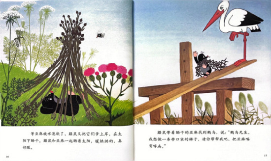 晒干亚麻后,鼹鼠带着它们找到了鹳鸟。它真诚地对鹳鸟说:“鹳鸟先生,我想做一条带口袋的裤子,请你帮帮我吧,把亚麻啄弯啄扁。”鹳鸟爽快地答应了,用它那长长的嘴巴,认真地啄着亚麻。