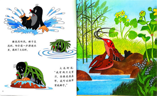 鼹鼠找啊找,找得眼睛都有些发酸了,裤子还是没个踪影。突然,“扑通”一声,它不小心掉进了水里。在水里,它幸运地遇到了大龙虾。大龙虾挥舞着两只威风凛凛的大剪刀,自信满满地说:“我有这两只大剪刀,你要是能找来布,我就能把它剪成裤子。”鼹鼠听了,心里燃起了一丝希望。