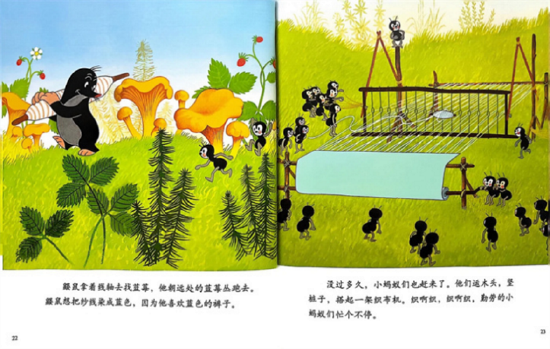 鼹鼠拿着线轴,兴奋地朝远处的蓝莓丛跑去。它想把纱线染成蓝色,因为它特别喜欢蓝色的裤子。
