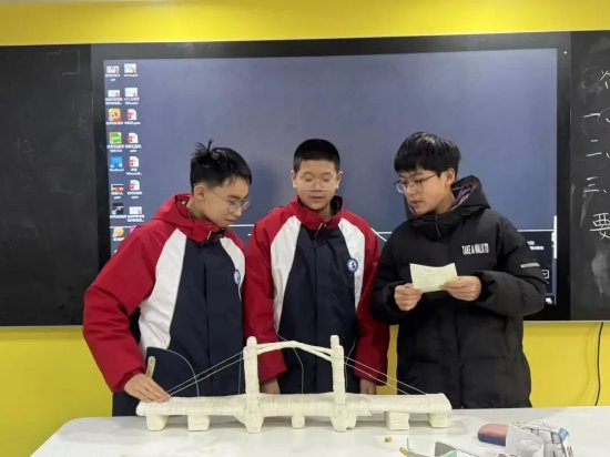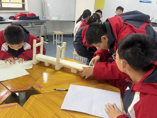 更令人欣喜的是,科技的种子在观看之后迅速萌芽。活动结束后,同学们意犹未尽,自发组织起纸桥制作实践活动。他们以小组为单位,运用科学课中所学的结构力学知识,结合“科晚”中提及的工程思维与材料创新理念,亲手设计、裁剪、搭建起一座座承载创意与合作的纸桥。这一从“观科技”到“做科技”的跨越,正是“科晚+科学教育”从认知走向实践、从启发转化为行动的生动体现。
