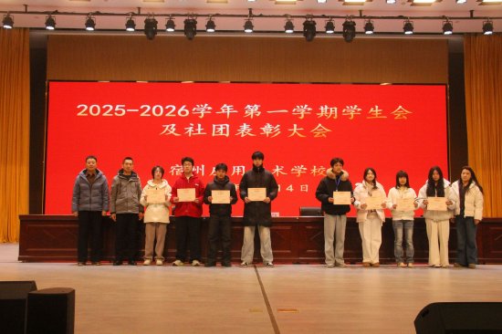 1月14日,宿州应用技术学校举行2025-2026学年度第一学期学生会干部及社团表彰大会。学校团委书记胡子夜、组织委员袁久龙、宣传委员黄梦洁出席大会,全体学生会干部、社团成员代表参会,大会由黄梦洁主持。