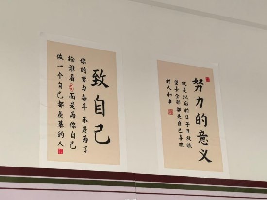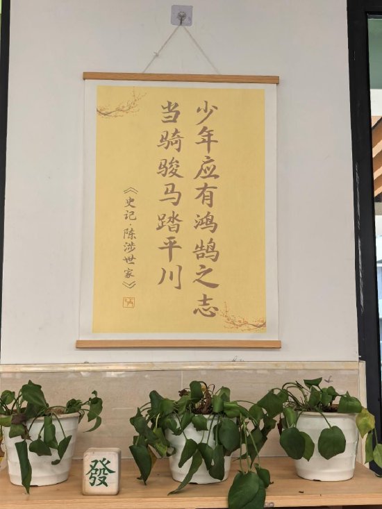 此外,不少班级设置了班级LOGO、“心愿墙”“读书角”“励志标语墙”等特色区域。其中有一张海报上写着“世界上最亮的光芒,一个来自太阳,一个是你努力的模样”,搭配绿植映衬,温暖而富有生机;另一处悬挂的红色纸艺灯笼,寓意吉祥与希望,为整个校园增添了节日氛围与人文关怀。
