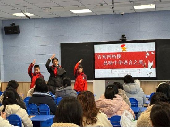 随后在合经区左茜工作室成员张燕老师的带领下,少先队员们以饱满的热情、清晰的语言进行了题为《告别网络梗,品味中华语言之美》的宣讲。