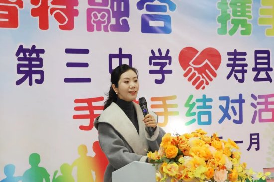 寿县三中校长杨高虹代表学校向特教学校师生致以问候,表示此次活动开展意义非凡,希望孩子们互相了解、积极互动,爱心结对,共同成长,携手为寿县普特教育发展贡献力量。