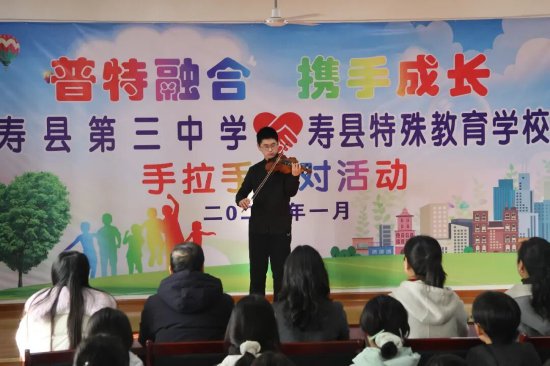 活动现场,寿县三中的学生代表轮番登场,为特教学校的孩子们带来了一场视听盛宴。马煜宸同学的小提琴独奏《如愿》悠扬婉转,用灵动的旋律传递美好期许;王旭同学的葫芦丝独奏《龙的传人》铿锵有力,彰显出少年学子的家国情怀;李馨冉同学的舞蹈《清荷忆》柔美典雅,以轻盈的舞姿诉说真挚祝福。特教学校的孩子们用一曲饱含深情的手语舞《听我说谢谢你》回赠这份温暖,真挚的情感流淌在每个人心中,温暖的氛围弥漫全场。