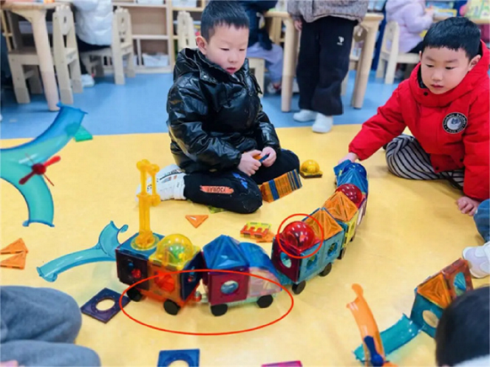 教师思考:无意的晨间谈话,让我更加坚信:儿童是主动的、有能力的学习者,而充满可能性的环境和敏锐的教师,是他们释放潜能的关键。为了进一步丰富材料的“联结性”:考虑引入“磁力墙贴”看它们能与现有建构体系碰撞出什么新发现。