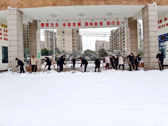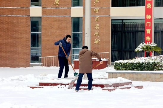 “雪停人动,闻令即行!”校党总支书记张东华、校长杨高虹带领党总支成员、党员教师和志愿者们顶着凛冽寒风在校园及包保路段开展除冰铲雪行动。大家不怕严寒,手持铁锹、扫帚、推雪板等工具,迅速投入战斗:有的弯腰铲起顽固冰层;有的挥舞扫帚清扫残余积雪;有的默契配合推送积雪,将冰雪集中转运至安全堆放点,整个清雪现场分工明确、干劲十足。尽管寒风吹红了脸颊、冻红了手,但每位志愿者的热情丝毫不减,一个个忙碌的身影在皑皑白雪中温暖的奔忙。