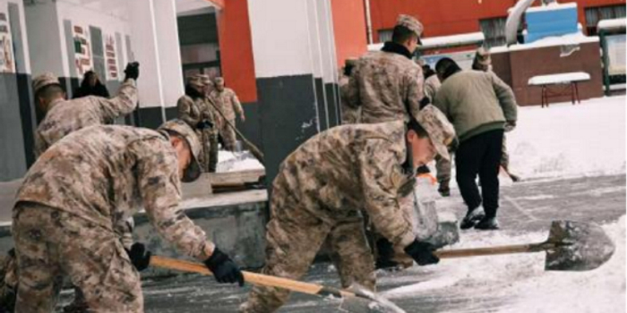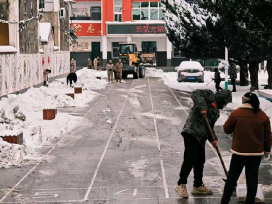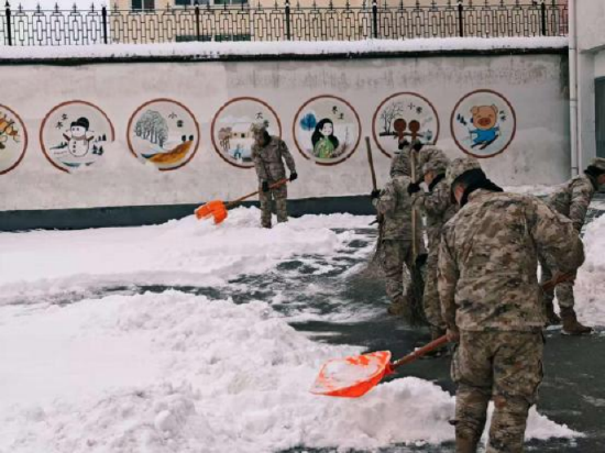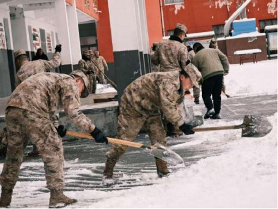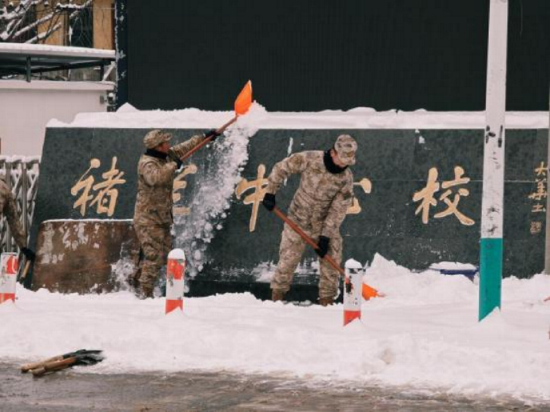 正在当地外训的驻徐“王杰”部队主动与学校对接,迅速组织官兵携带铁锹、扫帚等工具赶赴校园,和师生、民众携手开展铲雪除冰行动。