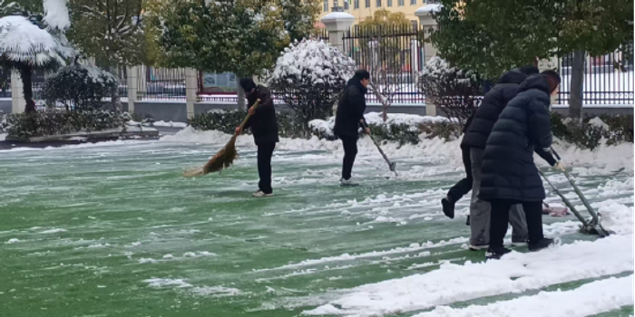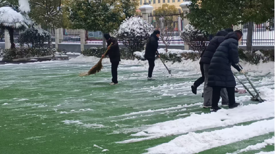 大家手持铁锹、扫帚等工具,按照划分的区域分工协作、默契配合。学校领导班子身先士卒,带头铲雪破冰,为大家作出表率;党员教师主动冲锋在前,挥动铁锹清理路面厚雪;年轻教师干劲十足,全力搬运雪堆。凛冽的寒风中,老师们的脸颊冻得通红,但手中的动作却丝毫没有放慢。经过数小时的不懈奋战,校门内外、教学楼前活动场地、校园主干道等重点区域的积雪被彻底清除干净。