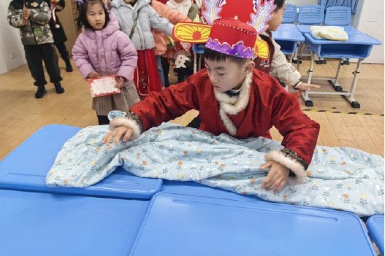 劳育促进关的“玫瑰勤劳・骏马践劳”环节充满生活气息。6人一组的小团队分工协作,有条不紊地整理小被子、摆放枕头,动作娴熟、细致认真。完成任务后,王晓蕾老师为孩子们郑重颁发“劳动玫瑰章”,让孩子们在实践中掌握生活技能,提升自理能力,深刻体会“劳动最光荣”的内涵。