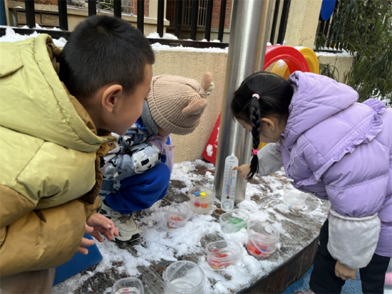 教师思考:大雪是自然教育的馈赠,孩子们冲进雪地,通过多种感官感受雪。在雪融化探究中,经历科学研究关键步骤,体会科学探究的魅力。