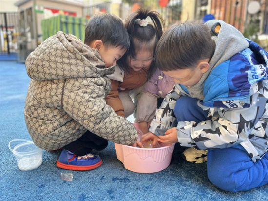 2026年元旦合肥飘起雪花,假期后孩子们聊起小雪,既兴奋又遗憾,期待能玩冰块。园所从冰箱取出冰块,孩子们欣喜地触摸、闻嗅、轻敲,感受冰的冰凉、硬实与透亮。