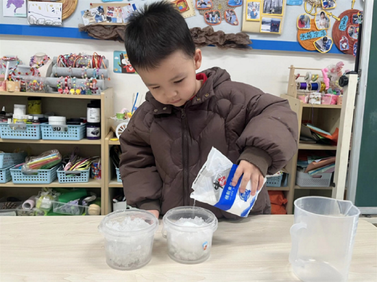 孩子们对水变冰充满好奇,纷纷猜测原因,如天气冷、放冰箱、低温才能结冰等。为满足探究欲望,孩子们进行了三次“结冰实验”:第一次:将水放在幼儿园操场;第二次:将水放在家里冰箱;第二组实验很快成功制出冰块,而户外实验中,孩子们发现水未结冰。观察温度计显示12℃,联系家庭冰箱温度,孩子们初步关联现象与温度数据。两周后合肥迎来大雪,气温骤降,孩子们开展第三次实验,将水置于操场。次日,容器中的水都结成了冰块,温度计显示0℃以下。结合科普视频,孩子们理解了水结冰需达到冰点(0℃以下)。